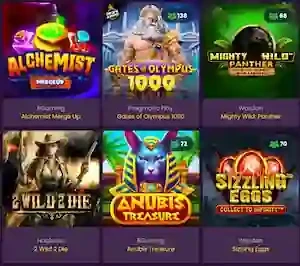 | Compra de Bônus | Alchemist Merge Up (BGaming), Mighty Wild: Panther (Wazdan), 2 Wild 2 Die (Hacksaw Gaming), Chillies in Red (Fugaso), Gemhalla (BGaming) e X-Demon (Evoplay) | ![]() |