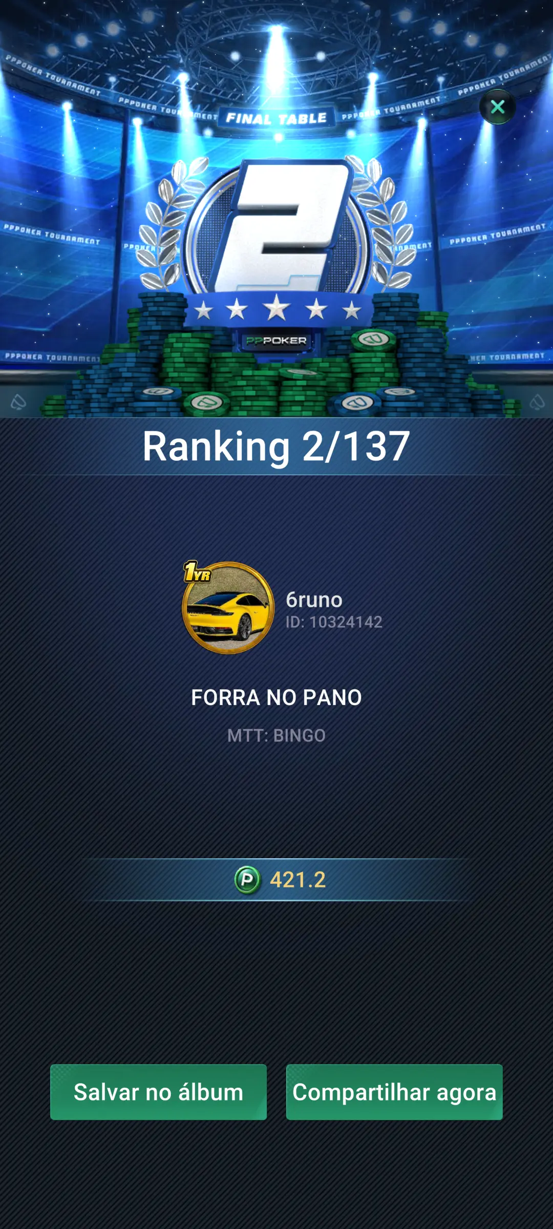 6° FT seguida no PPPoker , nesse torneio da manhã de R$10