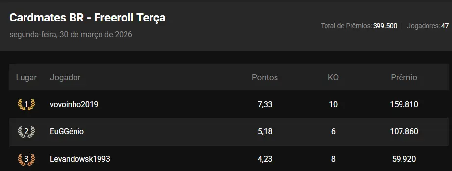 Campeões do Torneio Cardmates Freeroll Terça - 31/03/26 - Pote R$100 no PIX!
