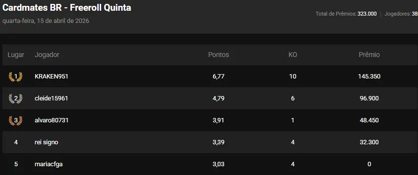 Bora para mais uma seleção daquelas, agora tivermos 38 jogadores, os quais ganharam o prêmio válido do pote no PIX com valor R$100. O torneio acontceu dia 16/04 de 2026 às 20h, segue a lista de classificação!