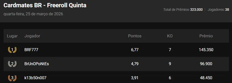Campeões Torneio Pokerstars Cardmates Freeroll 26/03/26 - Quinta Feira