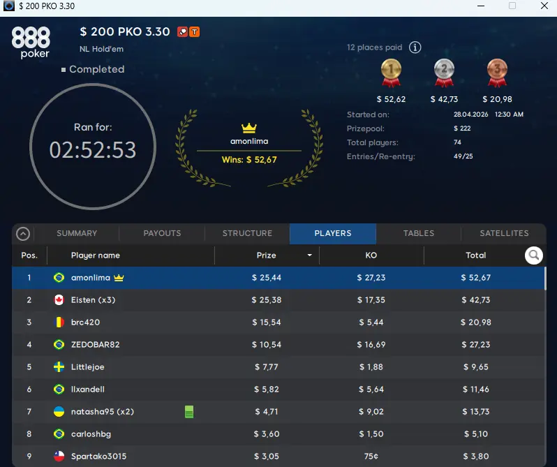 Hoje vim trazer um exemplo desse torneio que eu acabei de cravar. A situação estava bem critica, muita bad beat, perdi vários AA, tomei 1/2 outs no river contra um adversário que estava doando fichas. Nesse torneio que cravei, cheguei short stack, mas os erros grotescos deles me fez chegar devagarzinho e acabei indo para o HU, onde estava jantando o adversário, mas quando ia para o baralho ele ganhava, trocamos de posição no numero de fichas de 2 para 1, 4 vezes, todas eu absurdamente na frente, duas vezes que eu estava dominando ele dobrou as dele logo no flop, depois quebrou meu AA trincando um par menor, na outra ele fez um flush runner runner, e ainda conseguiu splitar um pote onde a board seguiu com o A no river, e eu já tinha a sequencia no flop. Mas, sempre me mantive confortavel e confiente não deixei me abater e na mão final veio um QQ vs 99 trinquei minha dama e ele também trincou o 9 kkkkk, até quando perdeu, perdeu com sorte!🤣