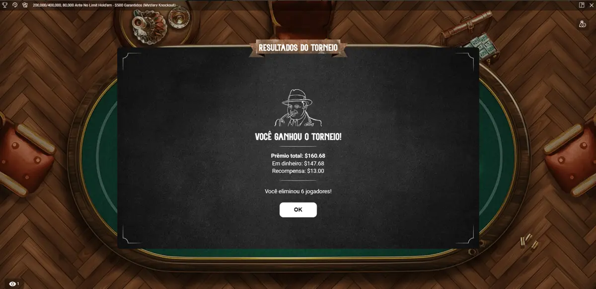 Dessa vez deu tudo certo. Eliminei 6 jogadores e fechei com $160 no total ($147 de premiação + $13 de KO).
