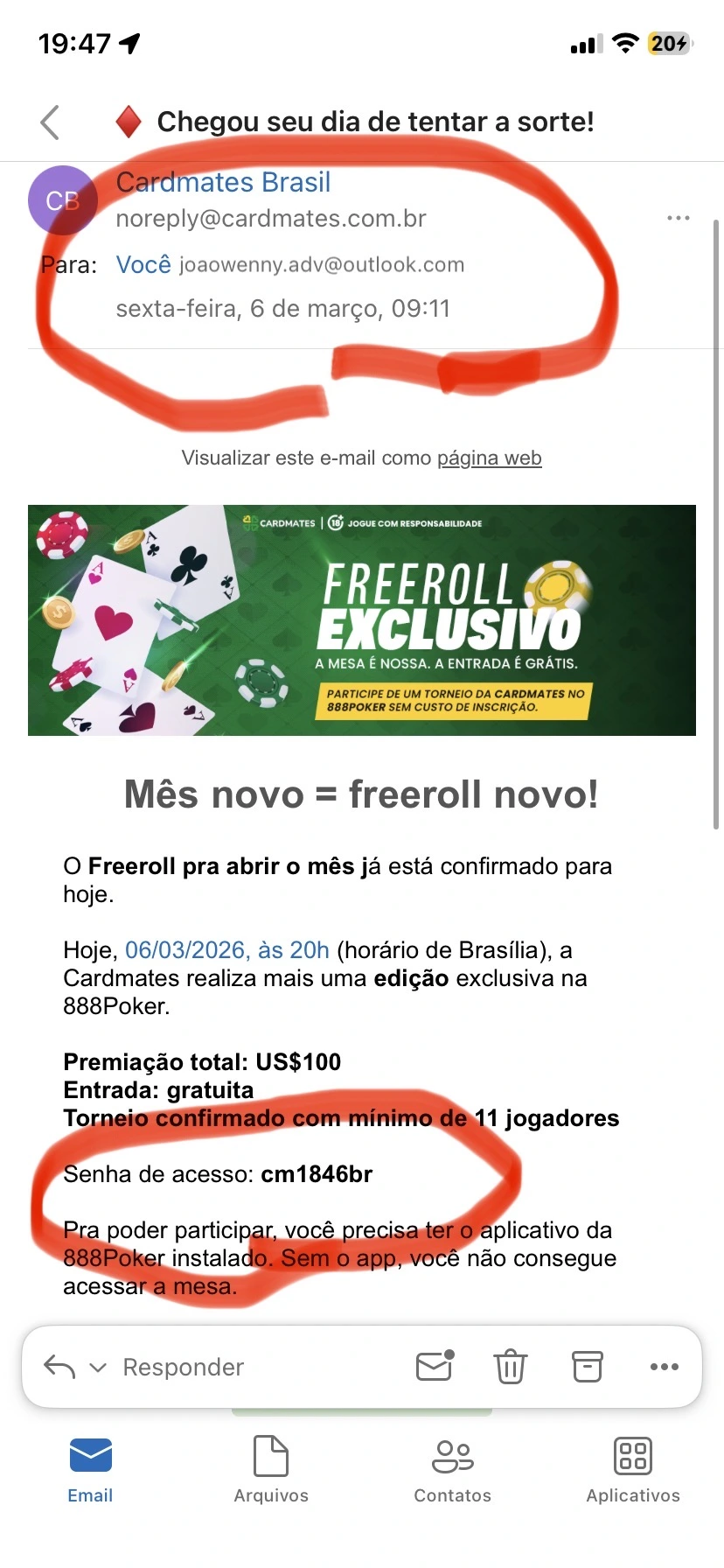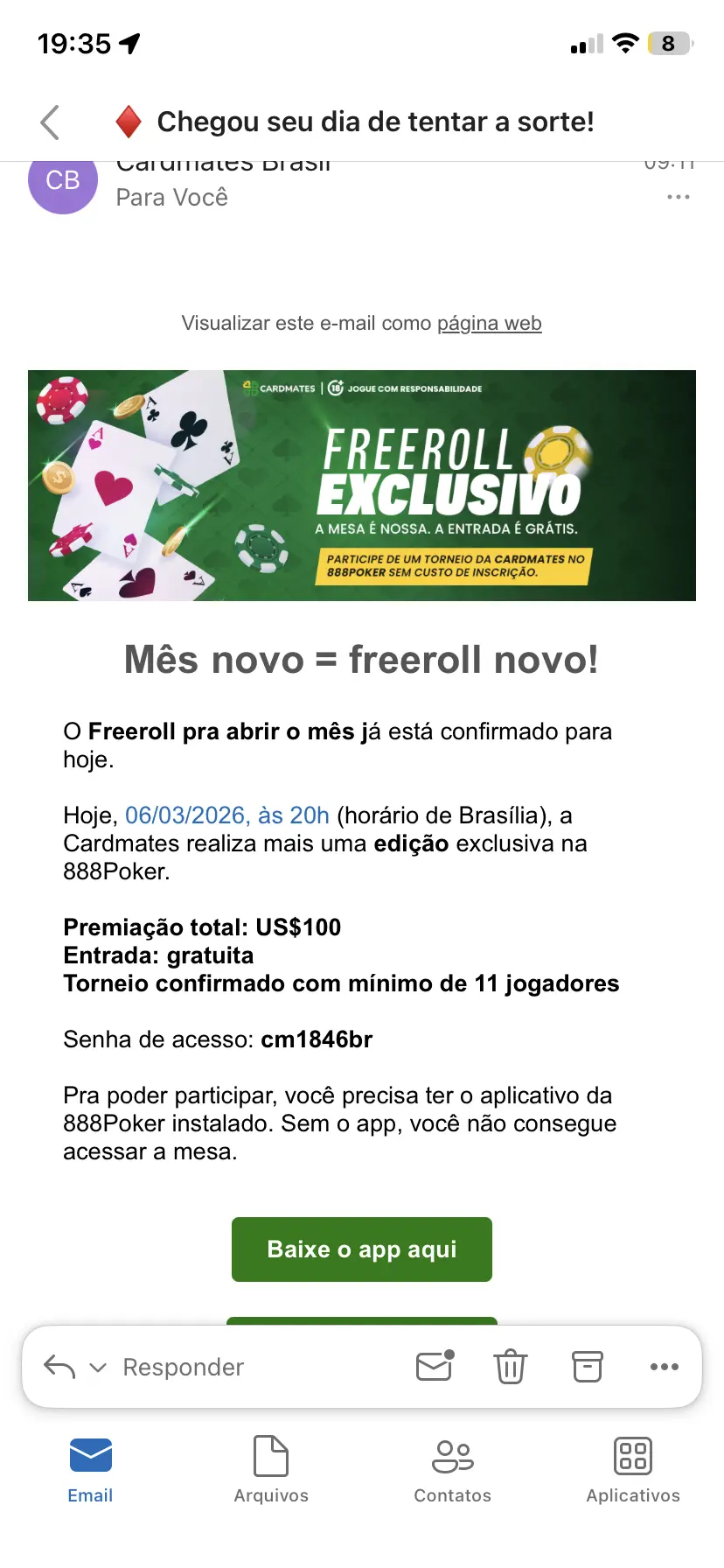 É HOJE! 20h (BRT) Freeroll Cardmates na 888Poker 💰 US$100 em premiação 🎟️ Gratuito 🔑 Senha: сm1846br ⚠️ Só consegue jogar quem estiver com o app da 888Poker instalado. Vai deixar as águas de março passarem ou vai buscar essa forra? Nos vemos nas mesas.