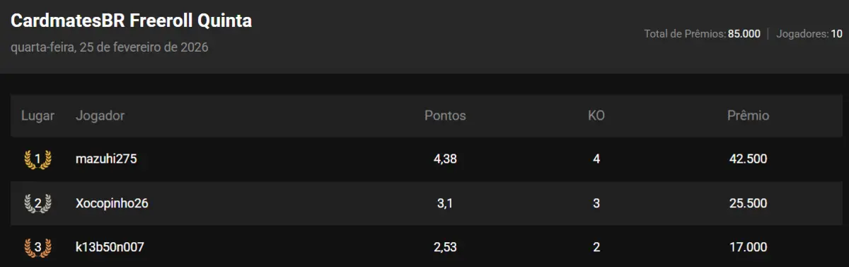 Resultado do Torneio de Freeroll da PokerStars com Prêmio em Pix do dia 26/02