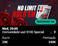 - Horário: 20:00h (Horário de Brasília) Modalidade: NL Hold’em Buy-in: Gratuito (Freeroll)