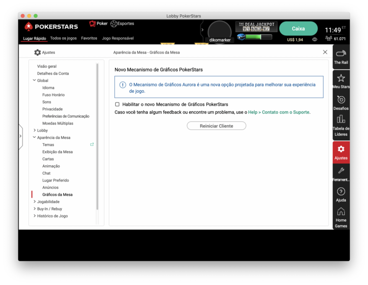 - Inicie o cliente da Pokerstars. Você receberá de volta a opção de desativar os gráficos aurora na Aparência da mesa> Gráficos da Mesa.